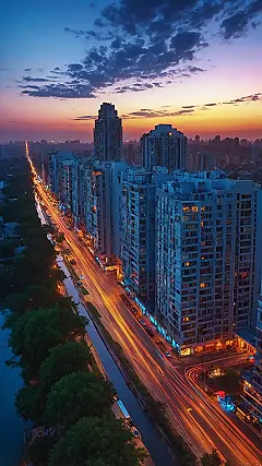 Check out this epic city scene! The sky is doing that cool gradient thing from purple to orange like a fancy art project, and the buildings are lined up like giant sentinels. Down below, the cars are zooming so fast they just leave streaks of light on the road, which basically makes the street look like a highway from the future. Having this dramatic view pop up on your screen is way more exciting than seeing your reflection trying to remember your lock code.