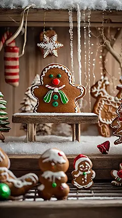This scene is the perfect example of gingerbread Christmas decorations taken to the next level! It’s much more charming than just hanging a few gingerbread men on the tree—this is a whole winter wonderland in miniature form! I can imagine this little gingerbread house sitting proudly on a mantelpiece, bringing holiday cheer to everyone who sees it. Maybe the gingerbread man is the homeowner, or perhaps he’s just visiting for a festive sugar cookie feast. Whatever the story, it’s undeniably delightful!