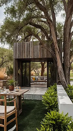 Picture this: ditching the indoor couch and sliding open a huge door to step right into this amazing outdoor spot. It’s like your living room decided to get some sun and hang out under a giant, super cool tree. Outdoor decor here isn’t just sticking a plastic chair outside; it’s about creating a whole vibe, a place where you actually want to spend time instead of being glued to your phone indoors. You can even see a comfy couch through the glass doors, showing that outdoor spots can be just as cozy as inside, but with way better natural lighting and maybe a squirrel friend or two.