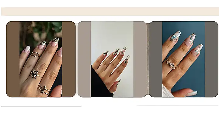 This picture shows some really cool nails with a ring that looks like a bunch of little leaves! It’s like nature has taken over your fingers. I love the way the ring looks like it’s growing out of the nails. It’s kind of like a tiny forest on your hand. It’s definitely a conversation starter, and maybe even a reason to start digging in the garden for some real leaves!