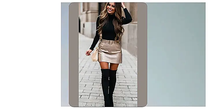 This outfit is like a warm hug for your legs – comfy black boots to keep the chill away! It’s also totally glam, thanks to the shimmery skirt. You’ll be the talk of the town with this look, especially if you’re headed out for a night of dancing or dinner. Forget about being cold, you’ll be too busy turning heads!