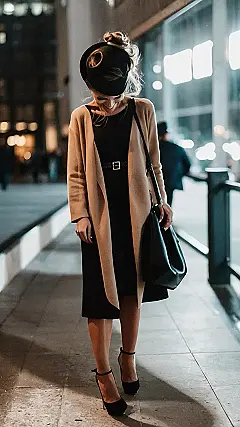 This outfit is the perfect blend of cozy and chic, perfect for a fall night out. You’ve got your trusty, warm camel coat to keep you snug from the evening chill, paired with sleek black jeans and killer boots that scream confidence. The black top and trendy accessories add a touch of sophistication, proving you don’t need to sacrifice style to stay warm!