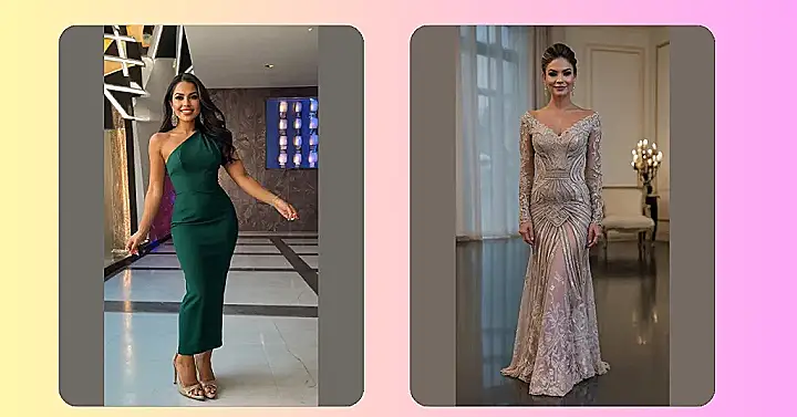 Imagine yourself stepping out of a vintage car (preferably one that matches your dress, just like in the picture!), ready to conquer the night. This outfit screams “sophisticated” and “ready for anything” – from awkward small talk with your crush’s parents to nailing that perfectly timed dessert fork drop (we all do it!). Just remember to practice your graceful exit beforehand. You know, just in case!