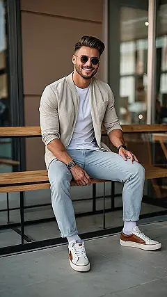 Want to look like you just walked out of a movie, even when you’re just chilling on a bench? This guy’s got it figured out! The secret? Keep it simple. A plain white tee, light wash jeans, and a cool jacket are your best friends. Plus, sunglasses are like the cheat code for instant coolness, and don’t forget the sneakers – they’re the punctuation mark at the end of a killer outfit.