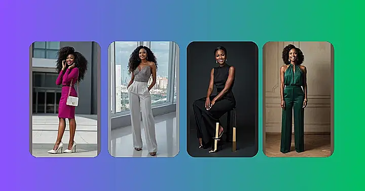 This image is all about owning your style! Our black lady is rocking a seriously stylish taupe pantsuit. It’s like a power outfit, but instead of screaming “I’m in charge,” it whispers “I’m effortlessly amazing.” The color is super chic, and the fit is perfection. This look is perfect for a job interview, a fancy dinner, or even just showing up your friends with your fabulous fashion sense. Who needs superheroes when you have a suit this cool?