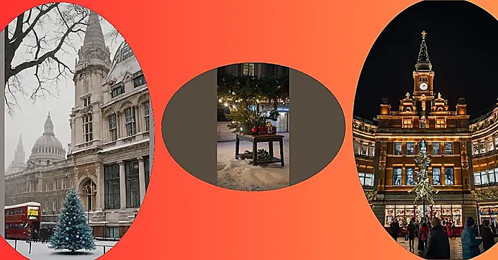 Imagine this: you’re in London, a blanket of snow softly falling, turning the iconic red double-decker buses into festive snow-topped treats. A beautifully decorated, frosty blue Christmas tree stands proudly in front of a stunning, snow-dusted building – it’s like a scene straight out of a Christmas movie! The whole place feels magically festive, even the grumpy-looking gargoyles seem to be smiling a little under the snow. It’s the perfect picture postcard of Christmas in London, wouldn’t you agree?