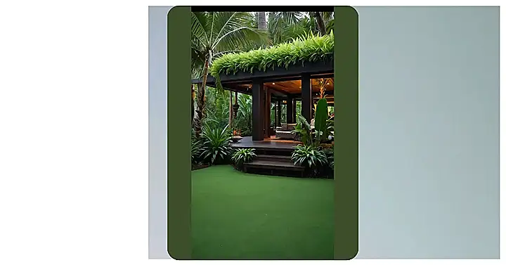 This backyard is totally giving me “tropical getaway” vibes! It’s like stepping into a jungle paradise, but with way more comfortable seating. Look at that awesome roof! It’s covered in ferns, which is way cooler than boring old shingles. And that green grass? It’s actually fake, which means you can chill out without worrying about watering or mowing! Talk about a low-maintenance vacation, right?