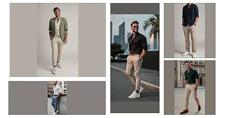 Want to ditch the same old jeans and t-shirt combo? Then peek at this dude’s outfit! He’s rocking a stylish, casual vibe that’s still put-together. It’s like he’s ready for a chill hangout with friends, or maybe even impressing someone special. Check out the green shirt and tan pants—it’s a colour combo that says, “I woke up like this…looking awesome!”