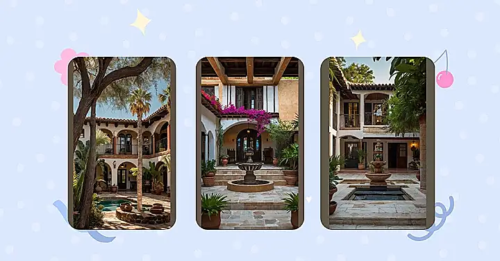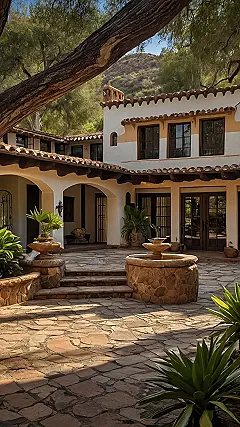The picture shows a gorgeous example of hacienda style. The stonework is so intricate, it’s like someone carefully placed each rock by hand (maybe they did!). Those fountains are the perfect spot for a quick dip (just kidding… unless?). Seriously though, the whole place looks super relaxing and stylish. If I lived here, I’d probably just spend all day lounging by the fountains and pretending I’m the star of my own Spanish-style sitcom.