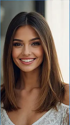 This picture shows some seriously stunning hair! Imagine walking down the hallway with hair this sleek and shiny – you’d be turning heads faster than a TikTok dance challenge goes viral. It’s the kind of hair that makes you want to run your fingers through it, and maybe even try a few selfies to capture its magnificent glory. The rich, dark brown color is just perfect, like melted chocolate with a hint of caramel, and the way it’s layered adds so much movement and volume. Forget about bad hair days; this is a good hair *forever* kind of situation!