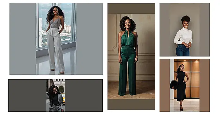 This image is all about owning your style! Our black lady is rocking a seriously stylish taupe pantsuit. It’s like a power outfit, but instead of screaming “I’m in charge,” it whispers “I’m effortlessly amazing.” The color is super chic, and the fit is perfection. This look is perfect for a job interview, a fancy dinner, or even just showing up your friends with your fabulous fashion sense. Who needs superheroes when you have a suit this cool?