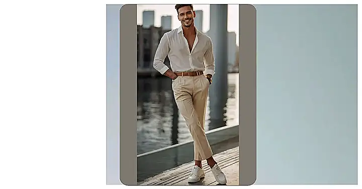 This guy’s got style for days! He’s rocking the classic white shirt and tan pants combo, but with a twist that makes it totally modern. No tie? No problem! He’s got that “I woke up like this” look down pat, and those white sneakers just add to the relaxed vibe. This style is perfect for a day out with friends, or maybe even a first date (just make sure you’re not wearing the same thing).