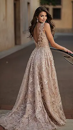 First off, wow! This dress is like if a fairy tale and a fashion show had a baby. The lace details are seriously stunning, and the color is totally giving off “I’m sophisticated but also ready to dance the night away” vibes. Just imagine showing up to prom in this. Everyone will be asking if you’re a princess or, like, a really important celebrity who decided to grace your prom with their presence.