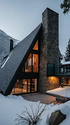 Imagine a cozy cabin nestled in the snowy mountains, but with a modern twist! That’s exactly what this house is all about. It’s like someone took a regular mountain cabin, gave it a makeover with sleek lines and big windows, and then said, “Let’s make it comfy, too!” You can practically picture yourself snuggled up by the fireplace (which is probably enormous in this house), sipping hot cocoa and watching the snow fall outside.
