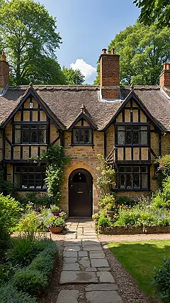 This place looks like it’s ready for its close-up! With those quirky brick chimneys standing proud against the blue sky and the sweet old-school windows, you can practically hear the house whispering secrets about who lived there centuries ago. It’s exactly the kind of spot you hope to find when you’re doing some ‘England village photography’ – all cozy corners, interesting textures, and that perfect mix of old stone and dark timber. You might even wonder if there’s a secret tea party happening inside, or maybe just someone really good at keeping their garden tidy!