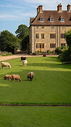 Trying to do some ‘England village photography’ usually involves finding these amazing old buildings and pretty landscapes. This photo nails the classic country house vibe with all its windows and chimneys. But adding the animals makes it way more fun and less like a boring history lesson. It makes you wonder if the photographer had to wait for the sheep to finish their snack break or gently ask a cow to moo-ve out of the way. It adds a funny, real-life layer to the ideal countryside scene, proving that even in perfect spots, nature and its fluffy (and not so fluffy) inhabitants are definitely in charge.