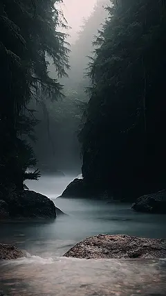 This picture is like a moody postcard from a fairytale forest! Imagine yourself snuggled up in a cozy blanket, sipping hot cocoa, while this dark, relaxing wallpaper sets the perfect chill vibe on your screen. Those mysterious, shadowy trees flanking the river? They look like they’re whispering secrets only the wind can understand – maybe even recipes for extra-delicious hot chocolate!
