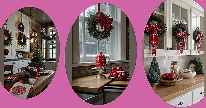Wow, check out this kitchen! It’s like Santa’s elves went wild with the Christmas decorations. Those wreaths hanging on the cabinets are seriously festive; they look like they’re ready to burst into a holiday carol any minute! The red and white ribbon bows are a perfect match for those yummy-looking red ornaments sitting on the counter. It’s giving total cozy Christmas vibes, and I wouldn’t mind sneaking a cookie or two from that jar!