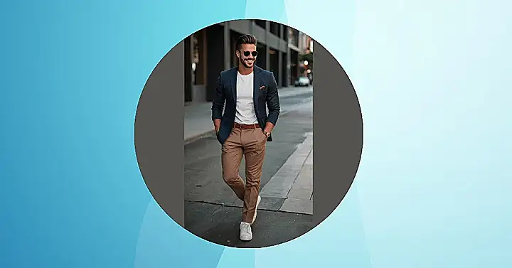 This guy’s outfit is seriously stylish, proving that being a perfect gentleman doesn’t mean wearing a stuffy suit all the time! His smart navy blazer and crisp white tee are like the perfect pair – super classic yet totally relaxed. Those khaki pants are a fantastic choice, not too formal, not too casual; they’re the Goldilocks of trousers! And let’s be honest, the sunglasses add that extra touch of suave. He looks ready to ace that presentation, grab a coffee with friends, or maybe even rescue a kitten from a tree – all while looking absolutely fantastic.