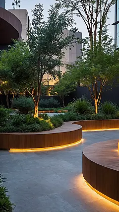 And check out those lights underneath the benches! It’s like the benches are floating on sunshine, or maybe just giving the ground a warm hug. It makes the whole spot feel a bit magical at night, perfect for escaping the city buzz without actually leaving. Someone clever had to figure out how to make wood bend like that and stick lights under it – major high-five to the urban landscape designers who decided cities needed more glowing, plant-filled chill zones instead of just… more grey.