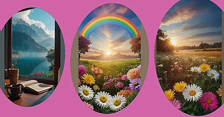 This picture is like a dream come true! It’s a beautiful morning, with a giant rainbow arching over a field of colorful flowers. The sun is peeking through the clouds, and the mountains in the distance look like they’re reaching up to touch the sky. It’s the kind of scene that makes you want to grab a picnic basket and spend the whole day outside, enjoying the fresh air and the beautiful sights.