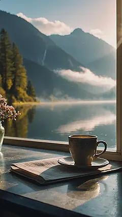 Imagine waking up to this view! A steaming cup of coffee on a windowsill, overlooking a peaceful lake nestled between majestic mountains. The air is crisp, the sun is just starting to peek over the horizon, and the clouds are like fluffy pillows floating across the sky. It’s the perfect morning for a quiet moment to yourself, maybe with a good book or just enjoying the beauty around you.