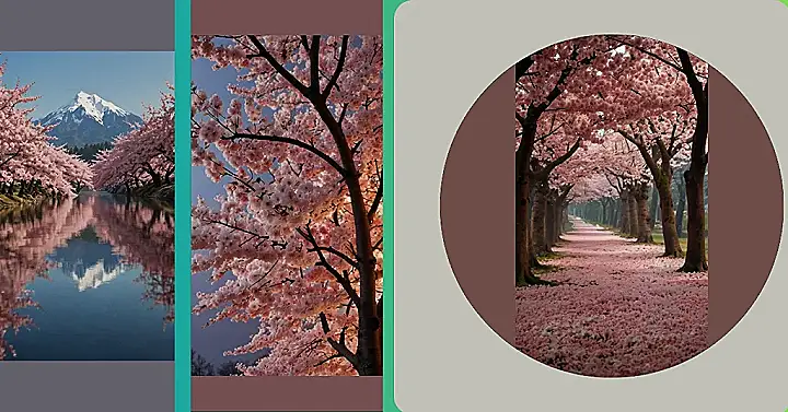 This picture is like a postcard from a dream! Imagine strolling along a calm river, surrounded by fluffy pink cherry blossoms that look like cotton candy trees. A majestic, snow-capped mountain watches over everything, and the whole scene is perfectly reflected in the water below – it’s like the mountain and the blossoms are playing a game of mirror, mirror! It’s so pretty, you’d want to make it your phone’s wallpaper, maybe even print it out and stick it on your ceiling!
