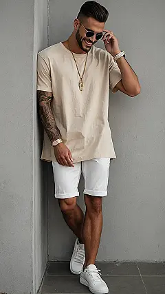So, you want to look cool without trying too hard? Check out this dude! He’s basically saying, “Yeah, I woke up like this… and decided to look amazing for my weekend.” Rocking a simple tee and shorts combo is key, but the accessories are what make it pop. The shades and bling are a good touch but don’t get carried away unless you want people thinking you’re auditioning for a music video.