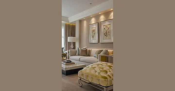 This room is like the ultimate chill zone, but with a touch of fancy! The couch and armchair look super comfy, perfect for binging your favorite shows or finally finishing that book you started, like, three months ago. The colors are super calming too, it is giving rich hippie vibes.