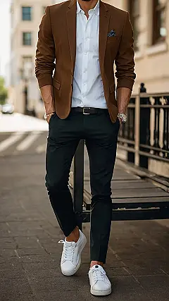 This guy’s got the corporate casual look down pat! He’s rocking a super stylish tan blazer – perfect for those days when jeans just won’t cut it. But see those awesome white sneakers? That’s the secret weapon. It proves that you can be dressed up and comfortable at the same time. No more aching feet from those stuffy dress shoes! It’s like a superhero suit, but instead of saving the world, he’s saving his feet and looking incredibly sharp while doing it.