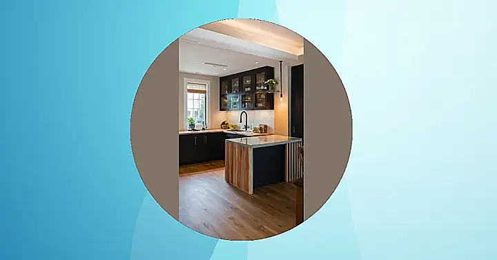 It’s got that “modern” vibe with its dark colours and clean lines, but it’s also totally “cozy” thanks to that gorgeous wood island. It’s like they took the best parts of a fancy restaurant kitchen and a super comfy living room and squished them together! You could totally imagine hanging out here, chatting with your friends while you whip up some delicious treats (or maybe just admire the beautiful design). It’s basically the ultimate hangout spot, disguised as a kitchen.