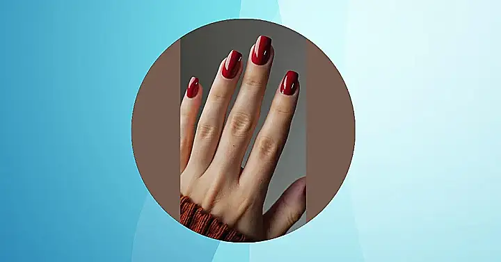 This image is all about cozy fall vibes and a touch of fierce style! The deep red nail polish looks like it’s straight out of a spooky movie but in a totally cool way. It’s like wearing the color of a yummy apple pie but on your fingertips. The way the polish shines in the light makes it look almost like a gemstone.