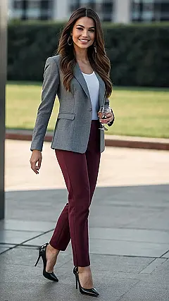 Hey there, fashionistas! Check out this awesome outfit – a grey blazer paired with seriously chic burgundy pants. It’s like a sophisticated adult version of your favorite comfy pajamas, but way more put-together. Imagine strolling into school, or even a fancy dinner with your family, feeling like a million bucks in this ensemble. This lady is definitely ready for anything – from acing that big test to enjoying a glass of (grape) juice after!
