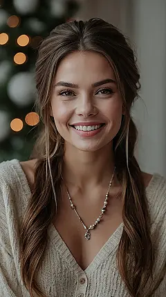 This hairstyle is perfect for those chilly winter days when you want to look and feel your best! It’s super easy to recreate and adds a touch of elegance to any outfit. The long, flowing waves give off a warm, cozy vibe, like a comfy blanket on a snowy day. The sparkly hairpiece is like a little piece of winter magic!