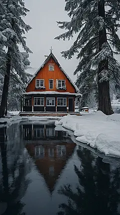 **Paragraph 1:** Check out this cozy cabin! It looks like something straight out of a fairytale, nestled in a snowy European landscape. Imagine waking up to a world covered in a blanket of white, with snow-dusted pine trees peeking at you from the windows. This little orange house is practically begging you to curl up by a fireplace with a mug of hot cocoa, maybe even with a good book (or a video game if that’s more your speed!). The best part? Its perfect reflection in the frozen lake is almost too pretty to be real – it’s like nature created its own magical twin!
