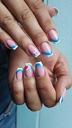 These nails are so pretty and simple, they’re practically a snowflake’s dream! Imagine snuggling up by a fireplace with a hot chocolate, and BAM! Your nails match the cozy vibes perfectly. Those pastel pinks and blues are like a winter sunset, and the tiny hearts are the cutest touch – it’s like your nails are having a mini Valentine’s Day party even though it’s freezing outside!