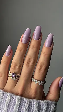 And check out those rings! They’re sparkling like tiny constellations – you could totally tell people they’re from another galaxy. Seriously, that’s a fantastic manicure that’s super stylish. You could even try painting some tiny stars or flowers on your nails to match. The whole look is effortlessly chic and totally Instagram-worthy, especially paired with that cute, comfy sweater. Who needs a tiara when you have lavender nails this fabulous?