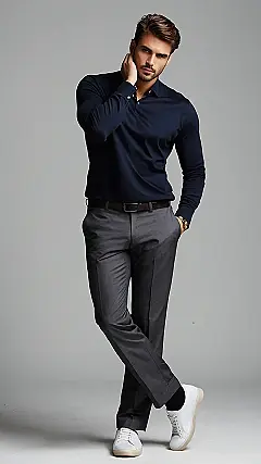 So, you’ve got a meeting, but jeans just aren’t cutting it. This guy’s got the perfect corporate casual outfit nailed! Think stylish, not stuffy. It’s a dark polo shirt – way more interesting than a boring button-down – paired with some sharp grey pants. He even threw in white sneakers for a comfy, yet polished look. It’s like business casual but way more fun. Who needs a tie when you’ve got this much swagger?