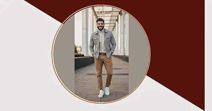 This guy is rocking the fall look! He’s got a cool gray jacket on, perfect for when it starts to get chilly but you don’t want to be bundled up in a big coat. Those tan pants are the perfect shade for the changing leaves, and let’s not forget those crisp white sneakers. He’s definitely got the “I’m ready for anything” vibe going on!
