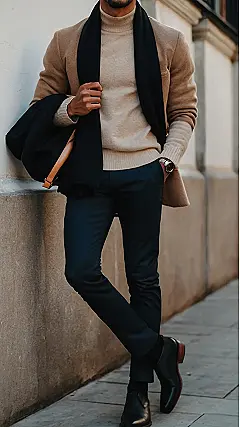 This guy is rocking the fall vibes! He’s got the perfect sweater for those chilly autumn days, and those brown boots are just begging to be worn with a pumpkin spice latte. This look is a good mix of casual and stylish, perfect for hanging out with friends, going to class, or even a date.