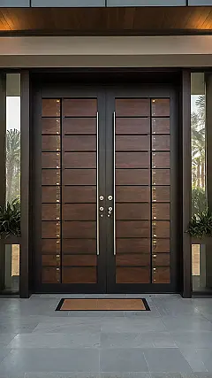 Wow, check out this main entry! Those aren’t just doors; they look like the entrance to a secret hideout for someone super important, or maybe just where they keep all the good snacks locked away. You could probably fit two of your friends walking side-by-side through those big wooden beauties, and those handles are so long, you might need a selfie stick to reach the top one. It really makes you wonder what awesome (or maybe just really clean) stuff is waiting inside past this epic doorway.