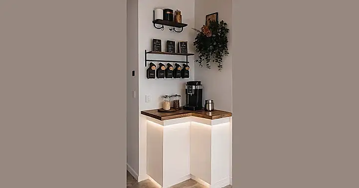 Tired of wandering around the kitchen like a zombie before school? Imagine having your very own coffee bar setup, just like the one in the picture, ready to zap you awake! Think of it as your personal caffeine command center, complete with cool lighting under the counter to make you feel like a legit barista. Having all your coffee essentials right there on a handy shelf means no more hunting for spoons or sugar when your brain is still buffering. Setting up your own coffee spot is a game-changer for those early mornings – it’s almost enough to make you look forward to getting out of bed (almost).