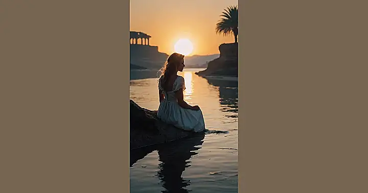 This picture is like a postcard from a dream! A beautiful girl, dressed in white, is sitting on a rock by a shimmering river. The sun is setting behind her, making the whole scene glow with a golden light. It’s so peaceful and quiet, you can almost hear the gentle sound of the water lapping against the shore. You can bet she’s lost in thought, probably planning her next adventure!