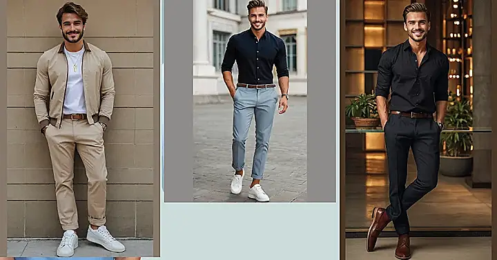 This guy’s got the whole “smart casual” thing down pat. He’s rocking a relaxed but stylish look, perfect for anything from hanging out with friends to going on a date. It’s like he’s saying, “I’m cool, I’m confident, and I’m ready for anything.” Plus, those pants are totally on point. They’re kind of like the comfy sweatpants of the grown-up world, but way more stylish.