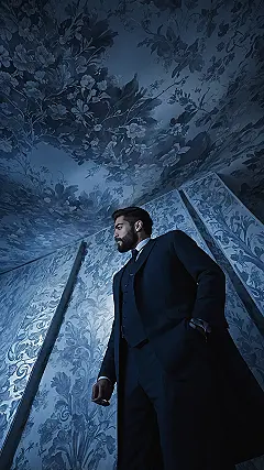 Who knew a room could be so fancy it practically wears a suit itself? This dapper dude looks like he’s contemplating the meaning of life, or maybe just how many more floral patterns his eyes can handle before asking for a plain white wall. That moody blue wallpaper is something else – it’s literally everywhere, from the walls to the ceiling, giving off major ‘secret garden at midnight’ vibes. It’s so detailed, you might actually get lost staring at it, which makes it perfect for… well, you guessed it!