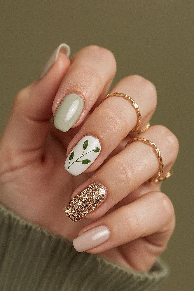 Discover sophisticated Short Gel Nails For Spring with this beautiful cream aesthetic. Soft sage green polish is elevated by delicate gold glitter and intricate leaf nail patterns, creating a refined look.