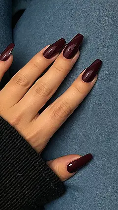 These nails are absolutely *killer*! They’re long and pointy, just like a witch’s claws. The deep, dark red color is perfect for autumn, and the shiny finish makes them look like they’re dripping with magic. Maybe they’re even cursed to turn heads everywhere you go! But seriously, how cool are they? They’re totally making me want to ditch my regular nail polish and get some dark fall nails of my own!