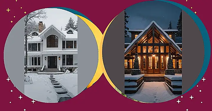 This house looks like something straight out of a holiday movie! Imagine cozying up inside with hot cocoa while watching the snow fall softly outside. The warm glow from the lanterns lining the steps leading up to the front door makes the whole scene feel magical, like a fairytale come to life. It’s the perfect winter house exterior, all decked out for the holidays— even the snow looks festive!