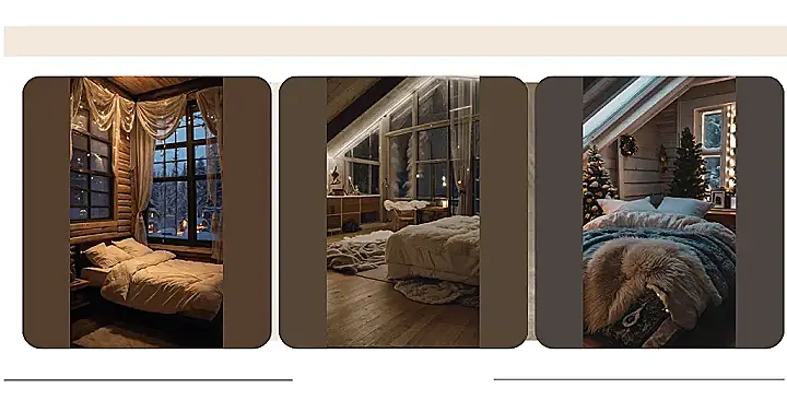This room is like a warm hug on a chilly day! Imagine snuggling under all those blankets, surrounded by twinkling lights and fluffy pillows. The little Christmas trees and the wreath on the wall make it extra festive. It’s a reminder that even when it’s cold outside, there’s a cozy place to be happy and relaxed. It’s like a winter wonderland you can experience every day!