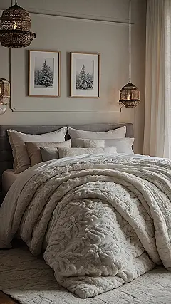 This bedroom looks like the perfect place to curl up with a good book on a snowy day. The fluffy blanket and soft pillows invite you to relax, while the picture of the snow-covered forest makes you feel like you’re right in the middle of a winter wonderland. The warm lights add to the cozy atmosphere, and the little touches of winter decor, like the pine cones and the fuzzy throw, make it feel extra special. You can almost hear the gentle sound of snow falling outside as you snuggle in for the night!